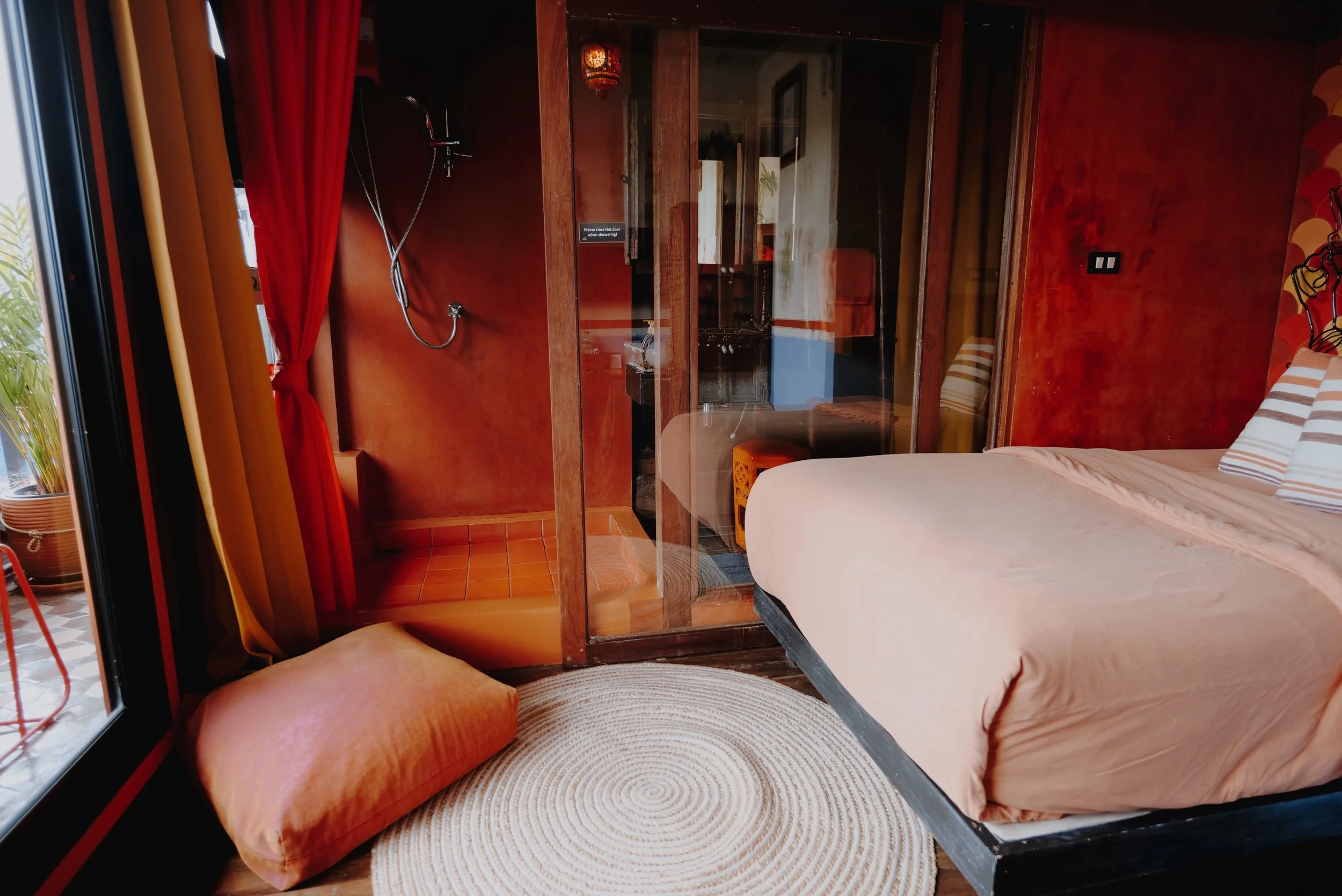 Chaque chambre a une couleur, et honnêtement, elles sont toutes superbes! Certaines ont un balcon, d’autres carrément une salle de bain avec baignoire…et il y a une chambre familiale avec des lits superposés.